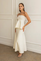 Mid-weight rib knit sweater fabric - Strapless - Sleeveless - Peplum design - Pullover design, no closure.