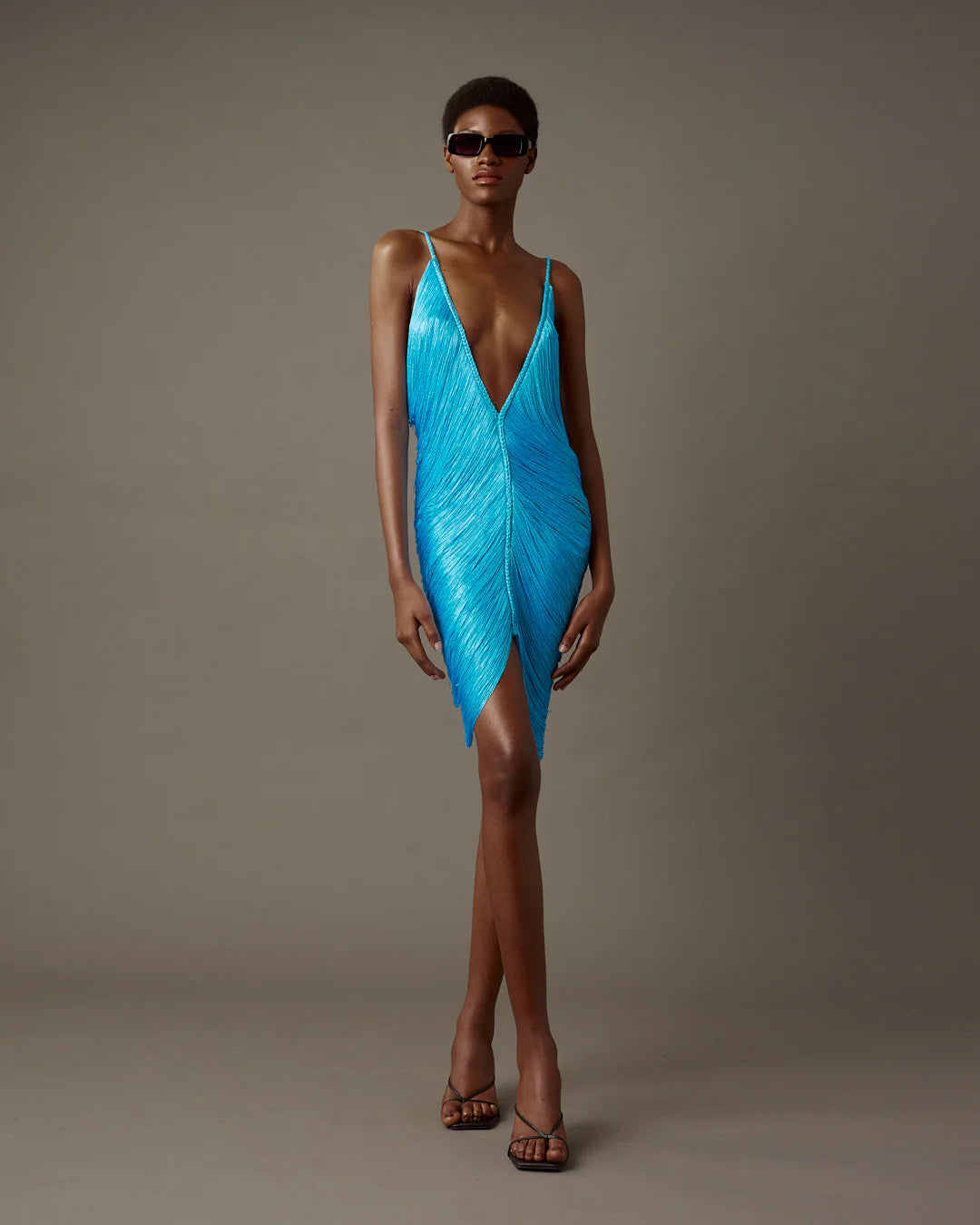 Esta pieza excepcional cuenta con un forro del mismo tono que los flecos, con propiedades elásticas que se adaptan a tu figura y una suavidad al tacto que te envuelve en comodidad y elegancia. El vestido Kaua es la elección perfecta para destacar en cualquier ocasión especial.