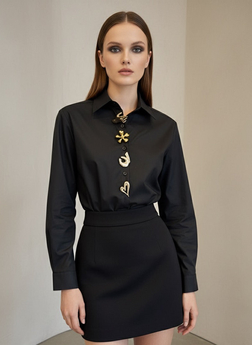Elevate your everyday wardrobe with this striking black button-down top that combines timeless style with meaningful details. Featuring decorative buttons adorned with heart, peace sign, and hand motifs, this piece transforms a classic silhouette into a statement-making essential. Perfect for expressing your individuality while maintaining sophisticated appeal, it pairs effortlessly with jeans, skirts, or trousers. The thoughtful embellishments add personality and conversation-starting charm to any outfit. A versatile must-have that proves fashion can be both polished and expressive.