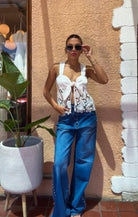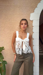 Satin lace top with front tie.