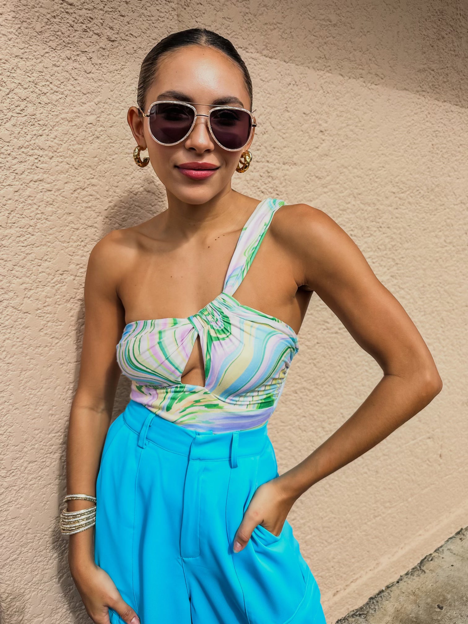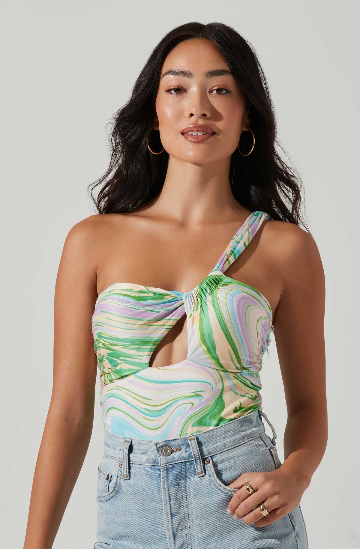 The Sindri Bodysuit features a one shoulder neckline that leads to a cutout accent at the bust. Attached thong bottoms have snap button closures.