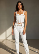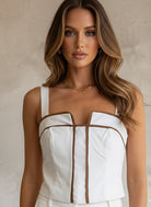 Elevate your everyday style with the Suenos Crop Top, a versatile essential that effortlessly transitions from day to night. Crafted in crisp white fabric with a delicate nude lining, this piece offers a flattering silhouette while maintaining comfort and confidence. The thoughtful lining detail ensures you can wear it solo or layered, making it the perfect addition to any wardrobe. Whether paired with high-waisted jeans, skirts, or tailored trousers, this crop top delivers modern sophistication with an undeniable edge. Discover why this timeless piece is a must-have for anyone seeking quality and style.