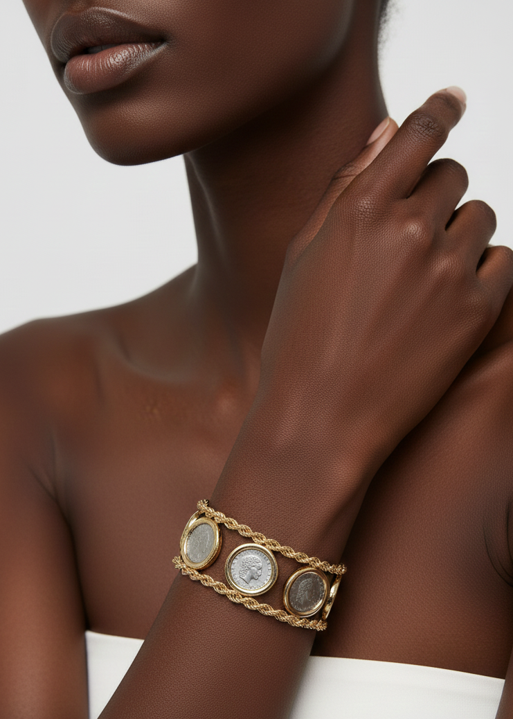 Elevate your wrist with the Villanelle 6 Coin Bracelet—a striking piece that blends timeless elegance with contemporary edge. Six gleaming coins dangle gracefully along a delicate chain, creating movement and dimension with every gesture. Perfect for layering or wearing solo, this bracelet transitions seamlessly from day to night, adding a touch of sophistication to any outfit. Whether you're drawn to its minimalist aesthetic or its subtle statement-making appeal, the Villanelle delivers versatile style that complements your most treasured looks.